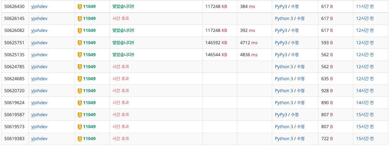 오랜 시간을 걸려 상향식으로 문제를 풀어냈는데 또 시간초과가 났다. 머리에서 김이 모락모락 나고있는데 JH가 pypy로 돌려보라고 했다. pypy로 제출했더니 ‘채점중’ 에서 변하지 않는다. 망했네하던 순간 갑자기 1% 오름 ㅎㅎ 어!? 하는데 또 1%로 오름.. 그렇게 한 5분 정도 채점하더니 4836ms이라는 무시무시한 결과가 나왔다