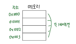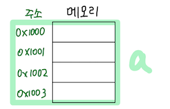 아래 왼쪽 그림을 보자. 4바이트의 메모리에 값을 저장할때 0x1000부터 1x1003 (메모리 주소는 16진수로 되어있다) 까지 저장한다고 해보자. 이 주소들을 매번 외워서 사용하는 번거로움을 피하기 위해 오른쪽 그림 처럼 0x1000부터 1x1003 의 이름은 a 야! 라고 a라는 변수를 통해 메모리에 이름을 붙여주는 것이다.