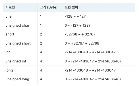 아래 표는 C 자료형의 종류와 범위이다. 정수형 타입에는 char, short, int, long이 있고, 실수형 타입에는 float, double, long double이 있다. 노란색 하이라이트를 한 타입들이 일반적으로 많이 사용하는 자료형이다.