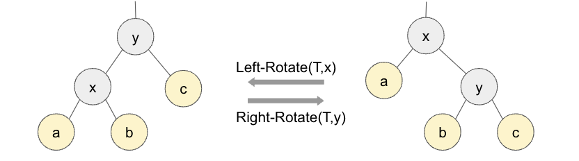 이렇게 회전의 특성은 이진검색트리의 특성 (왼쪽 자식 노드 <부모노드< 오른쪽 자식노드)을 보전한다. 우회전은 좌회전과 대칭으로 움직일 뿐 동일하게 이진검색트리의 특성을 보전한다. 아래의 그림과 같이 x에 대해 좌회전 한 그래프를 y에 대해 우회전하면 원래의 그래프이다.