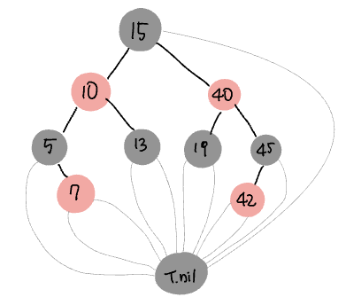 하지만 이렇게 수많은 NIL을 각각 표현하는 것은 메모리 낭비이다. 따라서 레드블랙트리 코드에서는 여러 NIL을 한번에 표현하기 위해 하나의 경계노드(sentinal) T.nil을 사용한다. NIL을 자식으로 갖는 모든 노드는 경계노드 T.nil를 가리킨다. (아래 그림 참고)