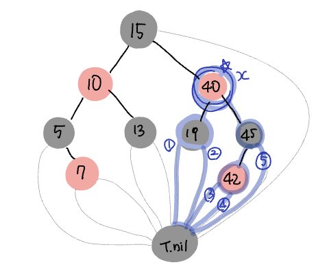 여기서 40이라는 값을 가진 노드를 x라고 할때, bh(x)를 구해보자. 노드 x에서 리프(T.nil) 까지 가는 경로는 5개이다. 아래 그림에서 파란색으로 경로를 표시해두었다. 레드블랙 트리의 다섯번째 특징으로 인해 이 다섯개 경로의 흑색 높이는 2이다. (경로 1,2의 경우 19와 nil 의 두 개, 경로 3,4,5의 경우 45와 nil 의 두 개)